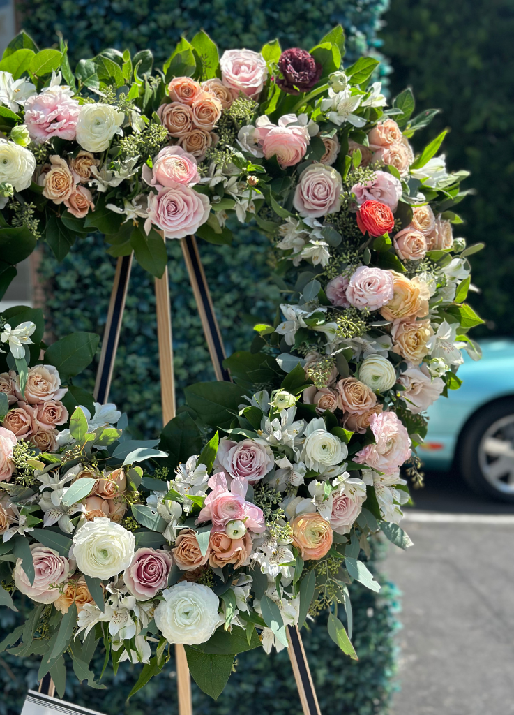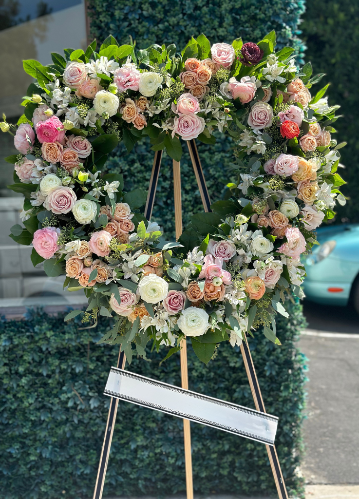 A heart-shaped wreath of pastel roses and soft florals symbolizing love, remembrance, and serenity. Garden of Grace offers a timeless expression of compassion, beautifully designed to honor a life remembered with tenderness. Featuring Garden-themed florals such as roses, greenery and ranunculus.