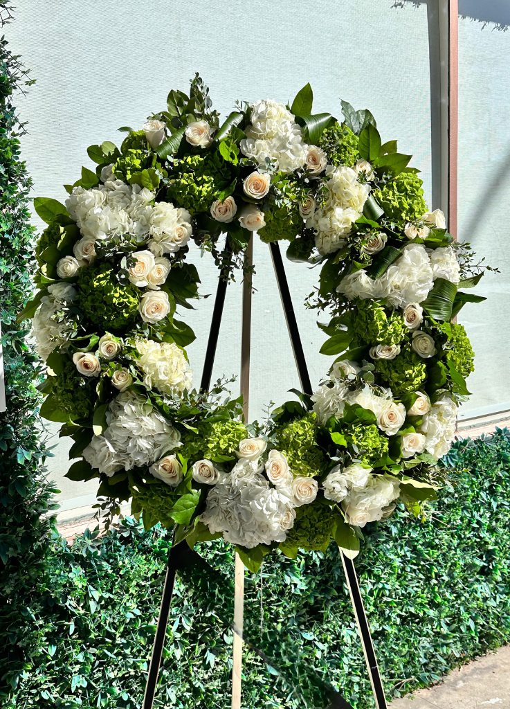 A serene wreath of white roses, hydrangeas, and soft greenery designed to express peace, remembrance, and everlasting love. Elegant and timeless, Harmony Garden brings a gentle sense of grace and comfort to any memorial service.