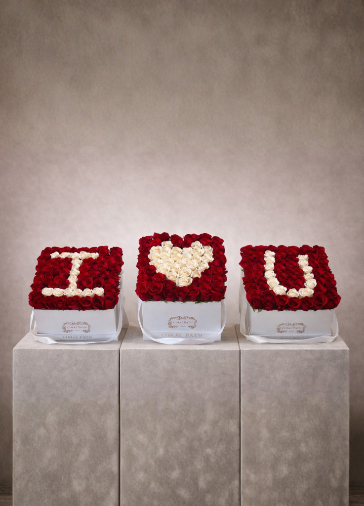 A charming floral arrangement featuring three sleek square boxes, each adorned with lush blooms that spell out “I ♥️ U” in vibrant petals. Make an impact with these stunning flowers.